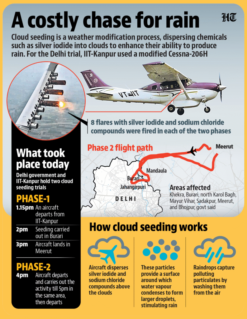 Two Cessna aircraft fitted with salt-based and silver iodide flares took off on Tuesday, few hours apart — one from Kanpur, another from Meerut — to induce artificial rains in Delhi.
