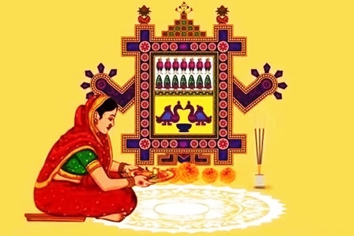 The legendary tale is based on the story of a village woman living near a dense forest who had seven sons. To prepare for Diwali, she decided to repair and decorate her house. She accidently killed some hoglets with spade while digging the soil as she tried to renovate the house. Days later, all her seven sons were nowhere to be found. seeking atonement for her sin, she decided to worship Goddess Ahoi on Ashtami and performed Ahoi Mata Puja. Pleased with her devotion and honesty, Goddess Ahoi appeared before her and granted long lives for her sons.